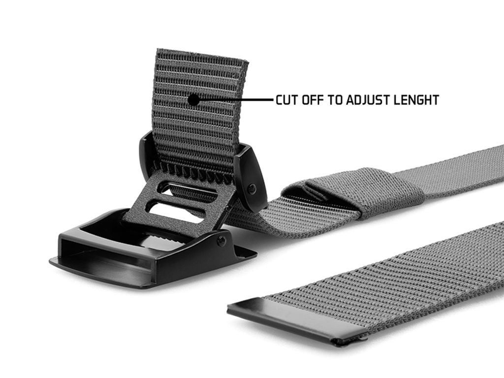 Skladá sa z kovovej pracky v matnom čiernom prevedení s bielym motívom. Pracka je vybavená jednoduchým mechanizmom, pomocou ktorého možno opasok zaistiť na požadovanej dĺžke. Samotný pásik je vyrobený z hrubej a odolnej tkaniny čiernej farby a je dostatočne dlhý, takže si ho môžete skrátiť podľa svojej potreby.