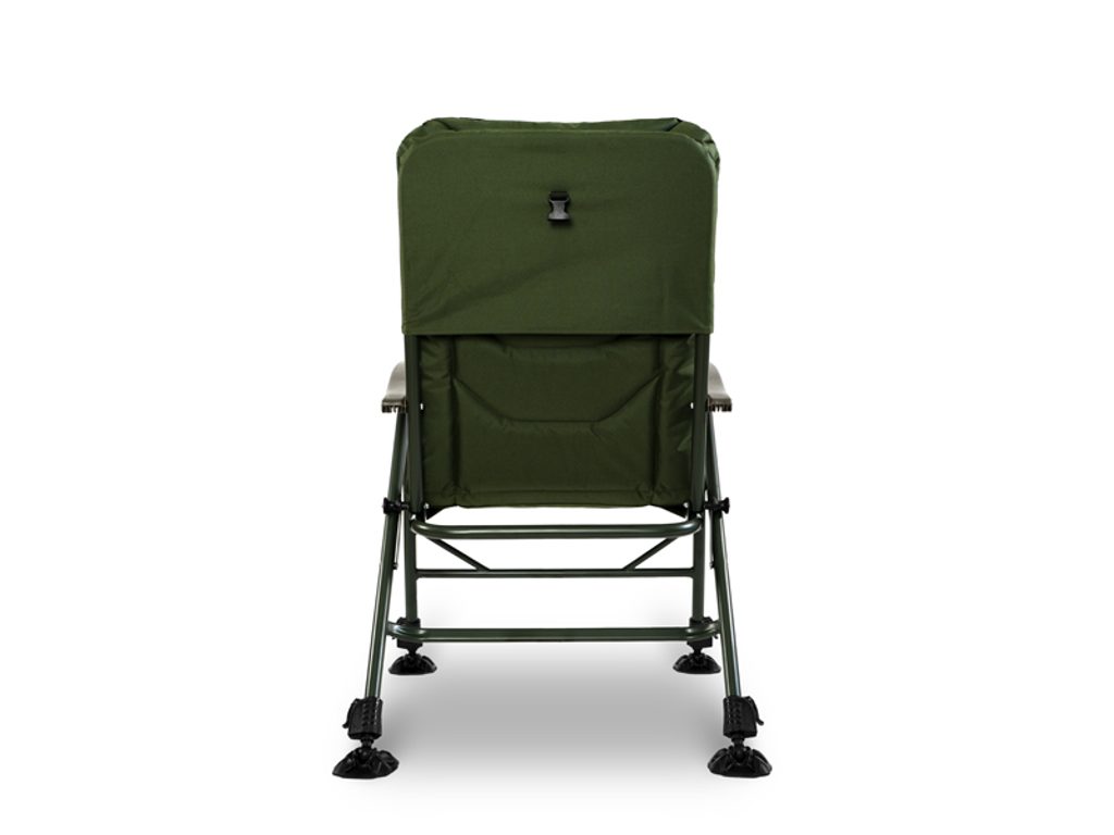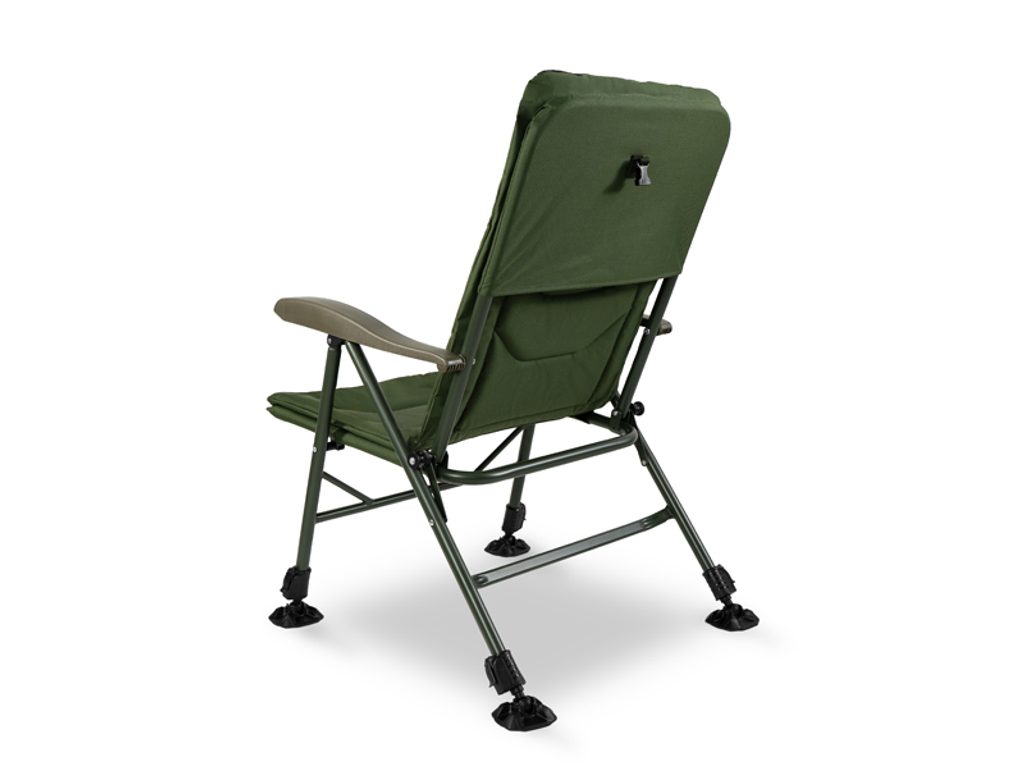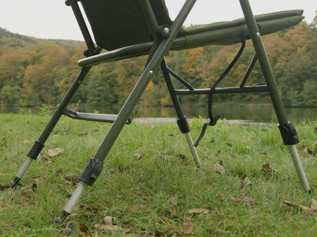 Výškovo nastaviteľné nohy umožňujú prizpôsobiť kreslo nerovnému terénu a zaručujú stabilitu aj v náročných podmienkach. O bezpečné zaistenie polohy sa starajú flexibilné robustné pätky, ktorých veľká plocha účinne zabraňuje zapadnutiu nôh do mäkkej pôdy pri vode. Navyše je kreslo vybavené plastovým klipom, ktorý fixuje jeho polohu počas prepravy a predchádza nechcenému roztváraniu.
