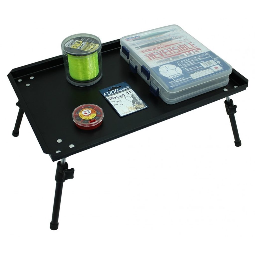 Skladací stolík je z plechu a doska je eloxovaná čiernou farbou, nohy majú rýchlo skladací mechanizmus a teleskopické nohy.