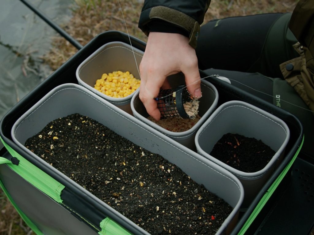 Veľkou výhodou je hlavná časť uzatvárateľná zipsom, ktorá po vybratí vnútorných častí poslúži ako samostatná transportná taška. Práve uzatvárateľné veko hrá kľúčovú úlohu pri ochrane obsahu – vytvára bariéru proti priamemu slnečnému žiareniu, čím zabraňuje vysychaniu krmiva a znehodnoteniu živých nástrah. Vaše krmné zmesi si tak zachovajú optimálnu vlhkosť a atraktívnu arómu počas celého lovu.